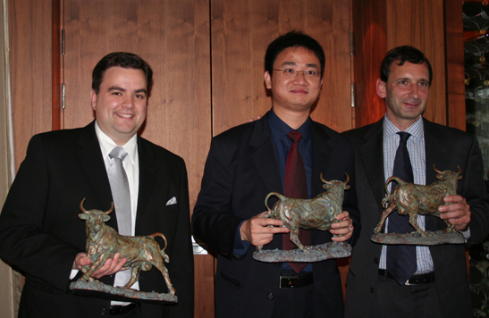 Gy�rgy Doleschall, Hungarian league winner (left), Hu Haochen, World league winner (center), John Rodrigues, Portuguese league winner (right).